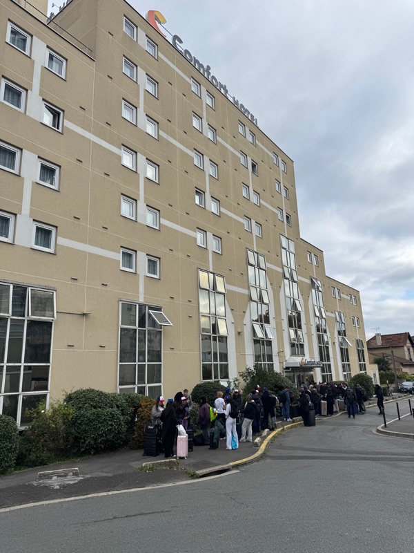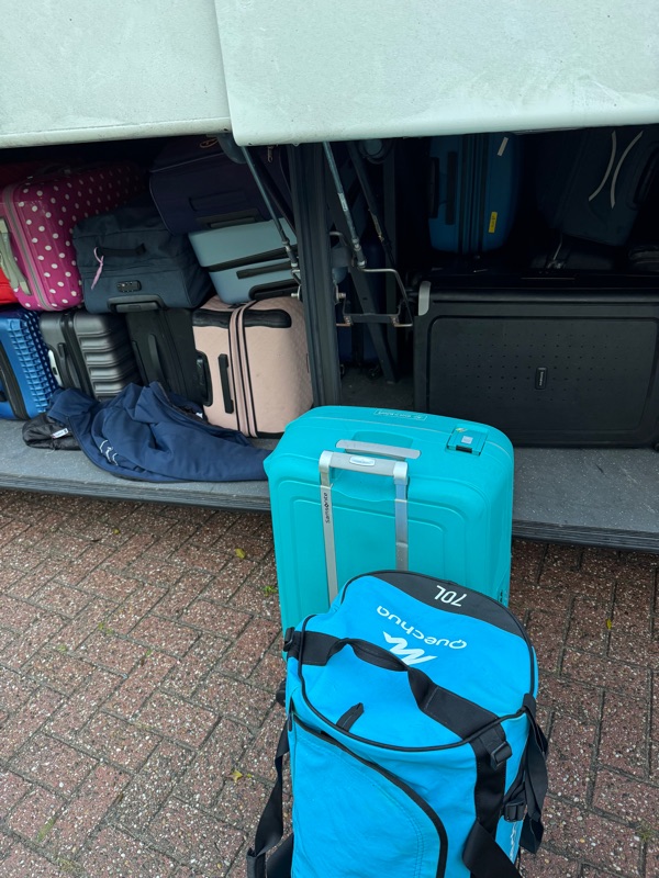 De bus stond vanmorgen in de (enige) file. De koffers zijn dit jaar ietsje groter dan normaal.